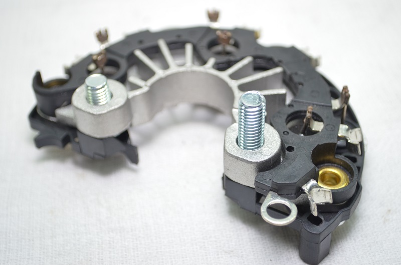 Диодный мост или выпрямитель. Может издавать воющие звуки при пробое диода. Часто является причиной выхода из строя генератора. Имеет две пластины - минусовую и плюсовую. На плюсовой пластине диодного моста есть болт, который силовым кабелем соединен с плюсом на АКБ